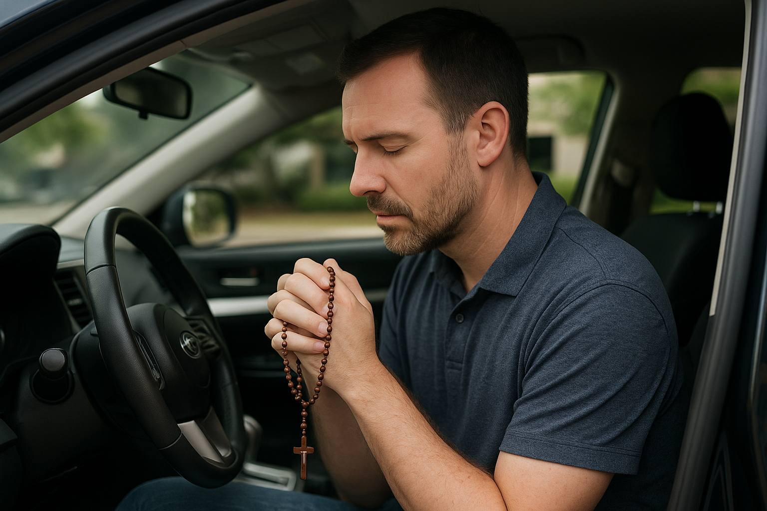 A quiet moment of prayer before the day begins, where the Rosary meets the road and grace meets the ordinary.